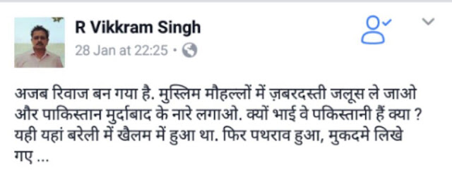 28 जनवरी को की गई अपनी एक पोस्ट में जिलाधिकारी कैप्टन राघवेंद्र विक्रम सिंह ने लिखा था कि “अजब रिवाज बन गया है। मुस्लिम मुहल्लों में जबर्दस्ती जुलूस ले जाओ और पाकिस्तान मुर्दाबाद के नारे लगाओ। क्यों भाई वे पाकिस्तानी हैं क्या? यही यहां बरेली में खैलम में हुआ था। फिर पथराव हुआ, मुकदमे लिखे गए…।”