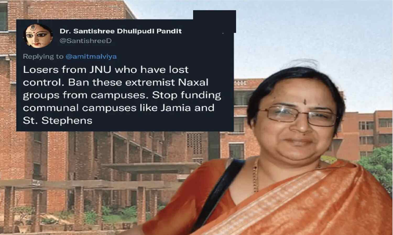 नई दिल्ली। जवाहरलाल नेहरू विश्वविद्यालय ( JNU ) की नवनियुक्त कुलपति शांतिश्री धुलिपुड़ी ( Shantishree Ghulipadi ) को लेक सोशल मीडिया पर जंग जारी है। खास बात यह है कि ट्विटर ने शांतिश्री अकाउंट को डिएक्टिव कर दिया है। इसके बावजूद वो सुर्खियों में हैं। अभी भी लोग एक ऐसे श्ख्त का वीसी नियुक्त करने का विरोध कर रहे है जो गोडसे का समर्थक व सीएए—एनआरसी विरोधी हैं। लोग सवाल यह उठा रहे हैं कि भला हिंदूवादी और पपेट बुद्धिजीवियों को वीसी जैसे संवैधानिक पदों पर कैसे बैठाया जा सकता है।