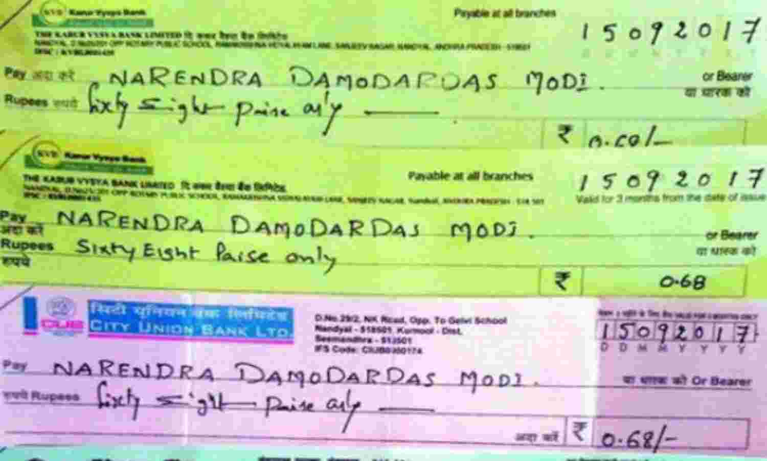 तेलंगानाा के किसानों ने उपहार में 68 पैसा इसलिए चुना है कि प्रधानमंत्री 67 साल पूरा कर आज 68वें प्रवेश कर रहे हैं। कर्नूल में सक्रिय संगठन रायलसीमा सागुनीति साधना समिति (आरएसएसएस) की ओर से हजारों की संख्या में चेक प्रधानमंत्री को भेजे गए हैं।