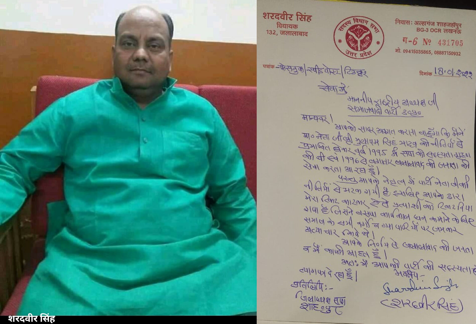 मंगलवार देर रात विधायक शरद वीर सिंह ने अपने फेसबुक अकाउंट पर समाजवादी पार्टी के राष्ट्रीय अध्यक्ष अखिलेश यादव के नाम संबोधित त्यागपत्र पोस्ट किया जिसमें उन्होंने कहा कि आपको सादर अवगत कराना चाहूंगा कि मैंने नेता जी मुलायम सिंह यादव जी की नीतियों से प्रभावित होकर वर्ष 1995 में पार्टी की सदस्यता ग्रहण की थी एवं 1996 से जलालाबाद की जनता की सेवा करता आ रहा हूं। परंतु आपके नेतृत्व में पार्टी नेता जी की नीतियों से भटक गई है। इसीलिए आपके द्वारा मेरा टिकट काटकर ऐसे प्रत्याशी को टिकट दिया गया, जिसने बसपा के कार्यकाल में धन कमाने के लिए समाज के सभी वर्गों पर, व्यापारियों पर अत्यंत अत्याचार किए थे। आपके इस निर्णय से जलालाबाद की समस्त जनता एवं मैं स्वयं काफी आहत हूं। अतः मैं आपकी पार्टी की सदस्यता से त्यागपत्र देता हूं।