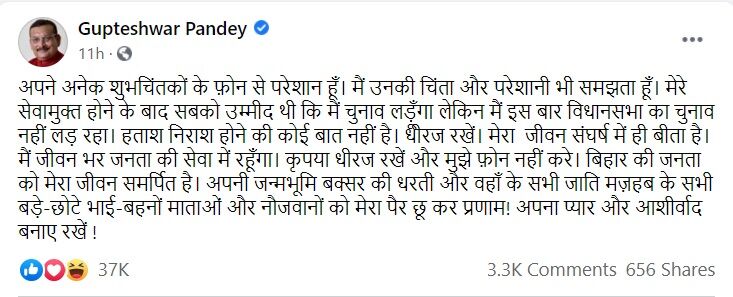 गुप्तेश्वर पांडेय ने फेसबुक पर पोस्ट लिखा 'अपने अनेक शुभचिंतकों के फ़ोन से परेशान हूं। मैं उनकी चिंता और परेशानी भी समझता हूं। मेरे सेवामुक्त होने के बाद सबको उम्मीद थी कि मैं चुनाव लड़ूंगा, लेकिन मैं इस बार विधानसभा का चुनाव नहीं लड़ रहा। हताश निराश होने की कोई बात नहीं है। धीरज रखें। मेरा जीवन संघर्ष में ही बीता है। मैं जीवन भर जनता की सेवा में रहूंगा। कृपया धीरज रखें और मुझे फ़ोन न करें। बिहार की जनता को मेरा जीवन समर्पित है। अपनी जन्मभूमि बक्सर की धरती और वहां के सभी जाति मज़हब के सभी बड़े-छोटे भाई-बहनों माताओं और नौजवानों को मेरा पैर छूकर प्रणाम! अपना प्यार और आशीर्वाद बनाए रखें!'