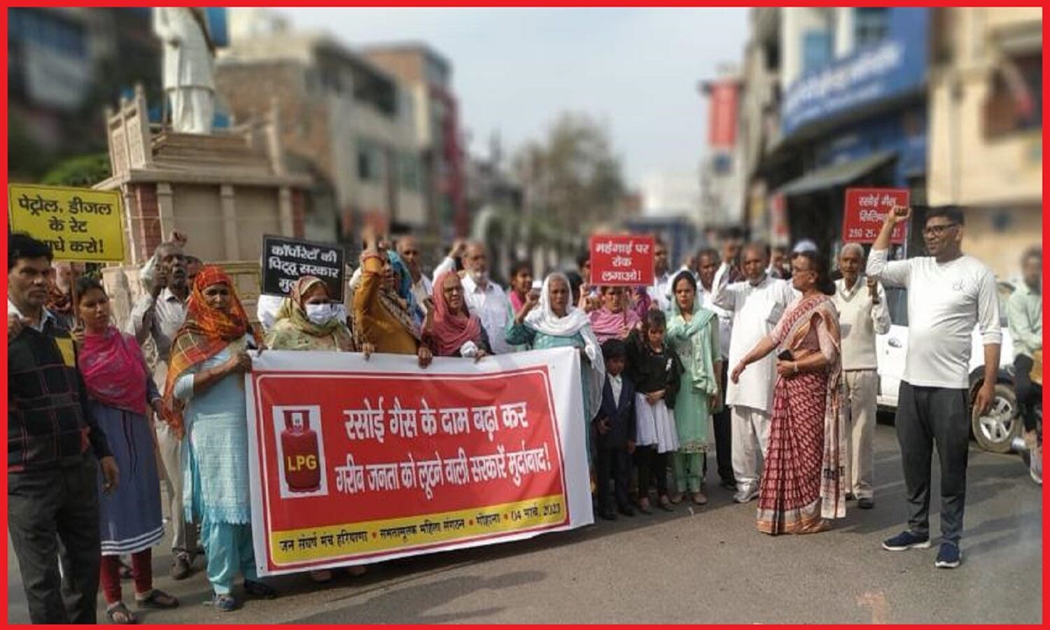 Haryana news : आज 4 मार्च को जन संघर्ष मंच हरियाणा व समतामूलक महिला संगठन ने केन्द्र सरकार द्वारा बढ़ाई गई रसोई गैस की कीमतों के विरोध में गोहाना शहर में प्रदर्शन किया। इसके समापन पर समता चौक पर केन्द्र सरकार व तेल कंपनियों का पुतला दहन किया।