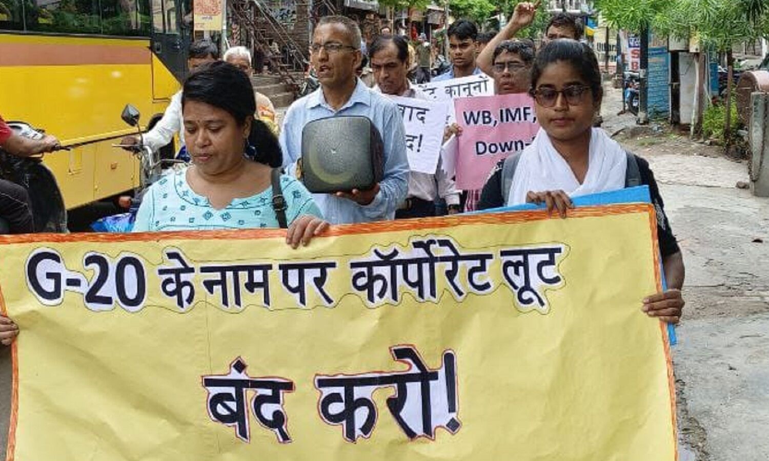 हाथों में "जी-20 डाउन-डाउन", "पेटेंट कानूनों को रद्द करो", "समाजवाद जिंदाबाद!", "साम्राज्यवाद मुर्दाबाद!", "आई.एम.एफ., डब्लू.टी.ओ., विश्व बैंक मुर्दाबाद!" लिखी तख्तियाँ लिए हुए प्रदर्शनकारियों ने अपने नारों के जरिए इस सम्मेलन को आम जनता के टैक्स के पैसे की बर्बादी और बहुराष्ट्रीय कॉर्पोरेट्स द्वारा दुनिया के विभिन्न बाजारों पर कब्जे की योजना बनाने का आयोजन बताया। पैदल मार्च से पूर्व छात्र-छात्राओं के साथ एक विचार-गोष्ठी का भी आयोजन किया गया।