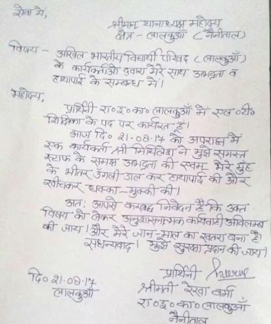 लालकुआं, नैनीताल। अखिल भारतीय विद्यार्थी परिषद से जुड़े कार्यकर्ताओं की गुंडई फिर एक बार सामने आई है। विद्यार्थी परिषद के कार्यकर्ताओं ने उत्तराखण्ड के लालकुआं क्षेत्र के स्कूल में घुसकर शिक्षिका के साथ दुर्व्यवहार किया है। शिक्षिका ने थानाध्यक्ष को दिए अपने शिकायत पत्र में लिखा है कि भाजपा के छात्र संगठन विद्यार्थी परिषद के सदस्य ने न सिर्फ पूरे स्टाफ के सामने मुझसे गाली—गलौच की, बल्कि मेरे मुंह में अंगुली भी डाली।