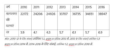 भाजपा के मई 2014 में सत्ता में आने के बाद से, बलात्कार की घटनाओं में साफ तौर पर तेजी से इजाफा हुआ है। एनसीआरबी की क्राइम इन इंडिया रिपोर्ट्स के मुताबिक, 2010 से 2016 के बीच प्रति एक लाख आबादी पर बलात्कार की घटनाएं और उनकी दर इस प्रकार है: