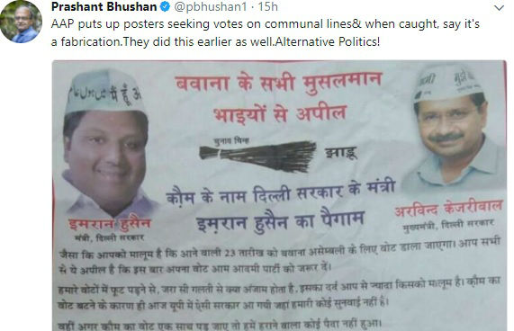 | आप विधायक इमरान हुसैन का वह साम्प्रदायिक पोस्टर जिस पर वरिष्ठ वकील प्रशांत भूषण ने किया ट्वीट |