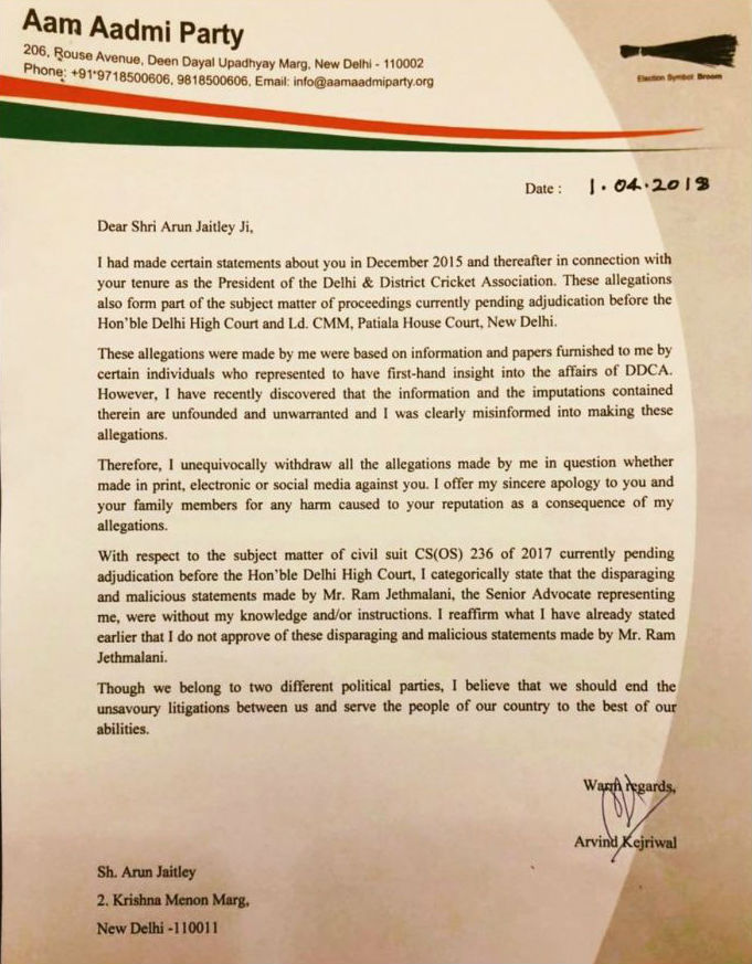 केंद्रीय वित्त मंत्री अरुण जेटली को लिखे पत्र में केजरीवाल ने कहा है कि 'जेटली जी, मैंने आपके डीडीसीए प्रेसिडेंट रहते वक्त कुछ गड़बड़ियों को लेकर दिसंबर, 2015 में आरोप लगाए थे। इसके लिए डीडीसीए से जुड़े लोगों ने मुझे दस्तावेज और सूचनाएं दी थीं। अब पता चला है कि ये सभी सूचनाएं आधारहीन थीं और मुझे गुमराह किया गया। मेरी ओर से आपके खिलाफ उठाए सवाल और बयानों के मीडिया में चलने से आपकी जो मान हानि हुई, उसके लिए मुझे खेद है, आई एम सॉरी।'