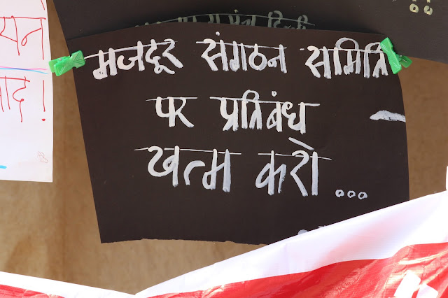 मजदूर एकता मंच की ओर से मजदूरों, ट्रेड यूनियनों, जन संगठनों से अपील का पर्चा वितरण किया गया। इस पर्चा में तीन मांग उठाने की अपील थी, मजदूर संगठन समिति पर प्रतिबंध खत्म करो! मारुती सुजुकी मजदूरों के आजीवन कारावास को खत्म करो और उन्हें बाइज्जत बरी करो! फैक्ट्रियों की दुर्घटना में मजदूरों के जीवन पर हो रहे हमले का पुरजोर विरोध करो! 1मई की शाम को एक पोस्टर प्रदर्शनी का आयोजन किया गया।