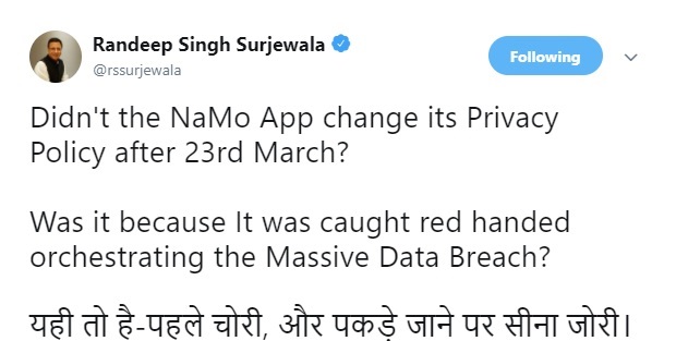 कांग्रेस के राष्ट्रीय प्रवक्ता रणदीप सिंह सुरजेवाला ने ट्वीट किया है, 'भाजपा और सरकार का यह गाल बजाना ही है क्योंकि खुलासे के अगले ही दिन नमो एप्प ने अपनी प्राइवेसी पॉलिसी बदल दी। इससे साफ है कि नमो एप्प के जरिए करोड़ों लोगों का डाटा एक प्राइवेट कंपनी को पहुंच गया है। खासकर मंत्रियों और सरकार के निर्णय भी।'