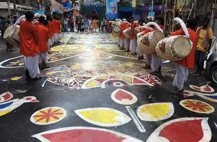 पश्चिम बंगाल में रंगोली अल्पना के नाम से ख्यात है। इस बार बनी रंगोली के बारे में कोलकाता की प्रसिद्ध दुर्गा पूजा समिति और इसे बनाने वाले समाजसेवी संघ का कहना है कि यह भारत का सबसे लंबा स्ट्रीट आर्ट है, जिसे 325 छात्रों ने 18 घंटे में पूरा किया है। जिसे बनाने में कुल 280 रंग सामग्री का इस्तेमाल किया गया है।