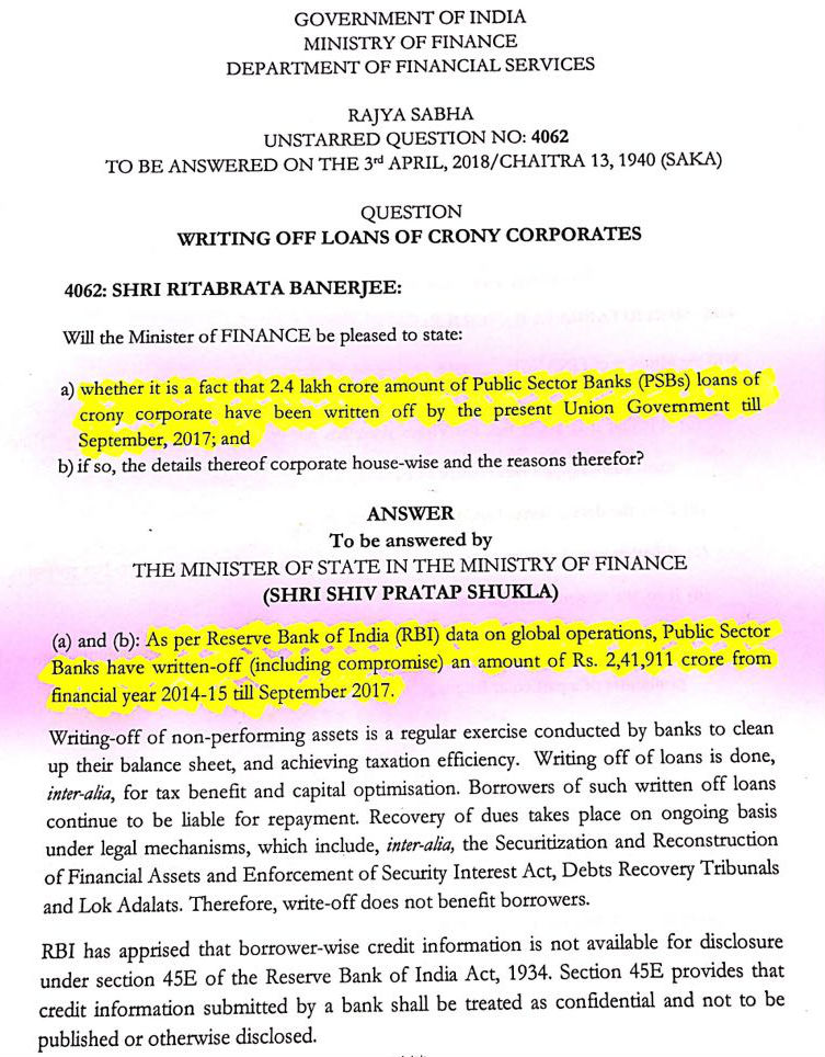 वित्त मंत्रालय की ओर से संसद में जवाब दे रहे वित्त राज्य मंत्री शिव प्रताप शुक्ला ने कहा वर्ष 2014—15 से लेकर सितंबर 2017 के बीच सरकार द्वारा संचालित बैंकों ने पूंजीपतियों के 2 लाख 41 हजार 911 करोड़ रुपए राइट आॅफ किए हैं। सरकार ने अपने जवाब में आगे जोड़ते हुए बताया है कि यह रिजर्व बैंक की नियमित प्रकिया है, उसी आधार पर यह किया गया है।