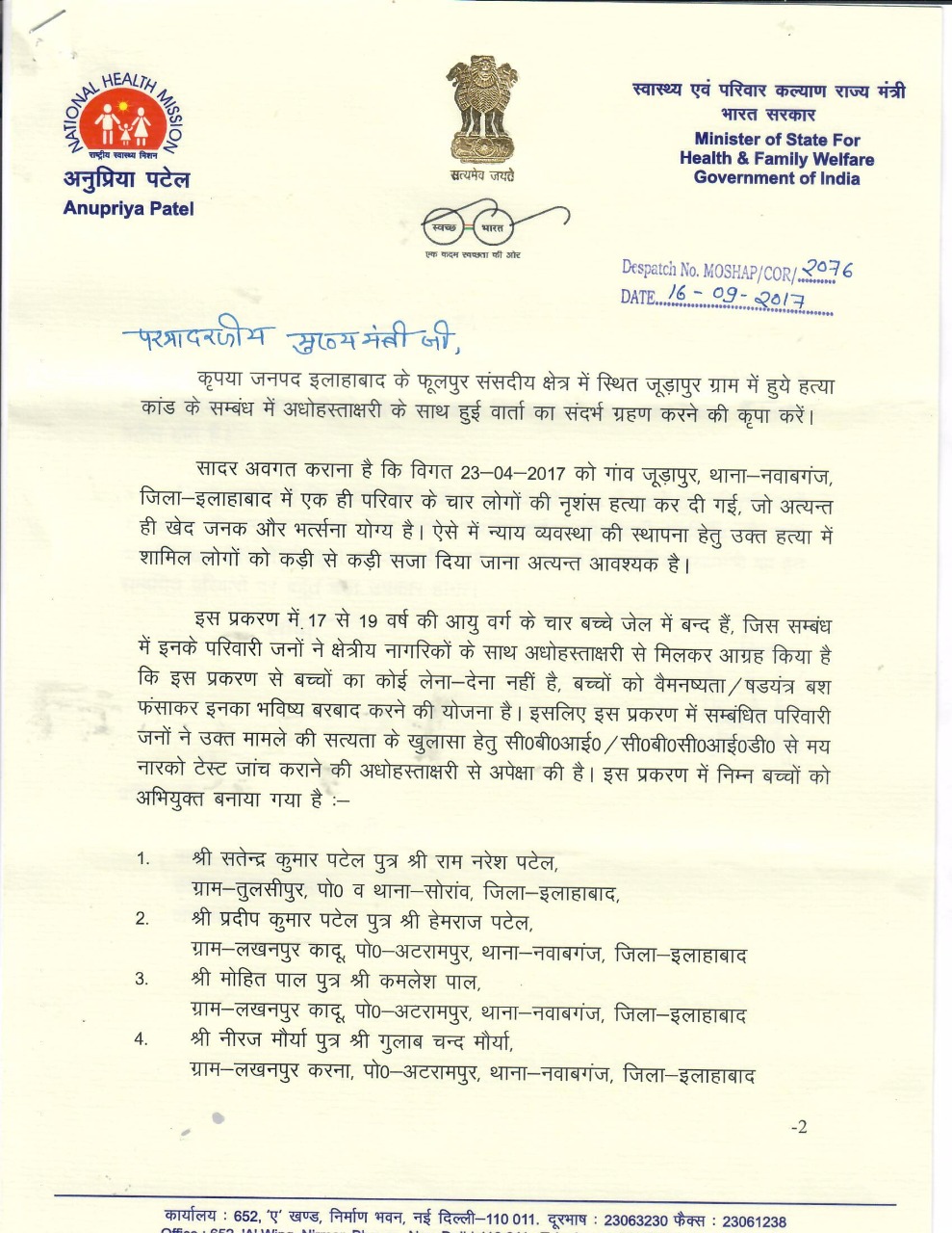 इलाहाबाद के जूड़ापुर में 23 अप्रैल को हुए चार लोगों के हत्याकाण्ड के आरोपियों को बचाने के लिए केंद्रीय स्वास्थ्य राज्यमंत्री अनुप्रिया पटेल ने यूपी के मुख्यमंत्री को पत्र लिखा है। पत्र में मंत्री ने कहा है कि जेल में बंद मासूम बच्चों को छोड़ दिया जाए, नहीं तो उनका जीवन बर्बाद हो जाएगा।