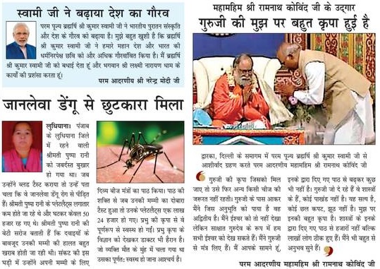 प्रधानमंत्री द्वारा पढ़े गए उन कसीदों के ठीक नीचे एक महिला का फोटो लगाकर विज्ञापन में लिखा है, 'डेंगू के कारण श्रीमती पुष्पा रानी के प्लेटलैट्स लगातार कम होते जा रहे थे और घटकर केवल 50 हजार रह गए थे। श्रीमती पुष्पा रानी की बेटी सरोज बताती हैं कि दवाइयों के बावजूद उनकी मम्मी की हालत बहुत खराब होती जा रही थी। संकट की इस घड़ी में उन्होंने अपनी मम्मी के लिए दिव्य बीज मंत्रों का पाठ किया। पाठ की शक्ति से जब उनकी मम्मी का दोबारा टेस्ट हुआ तो उनके प्लेटलैट्स 1 लाख 24 हजार हो गए। प्रभु की कृपा से वे पूर्णरूप से स्वस्थ्य हो गईं। प्रभु कृपा के विज्ञान को देखकर डॉक्टर भी हैरान हैं।'