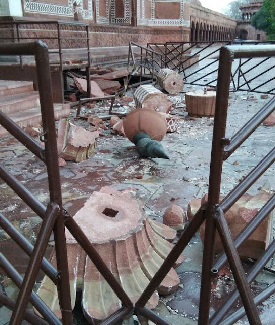 आंधी—तूफान बारिश के बवंडर में ताज के रॉयल गेट के ऊपर लगा लगभग 15 फीट ऊंचा पिलर टूटकर गिर गया, साथ ही दक्षिणी गेट के पर लगा आठ फीट ऊंचा पिलर भी टूटा। सरहिदी बेगम (सहेली बुर्ज) के मकबरे की छत का गुलदस्ता नीचे आ गया और परिसर में कई पेड़ उखड़ गए।