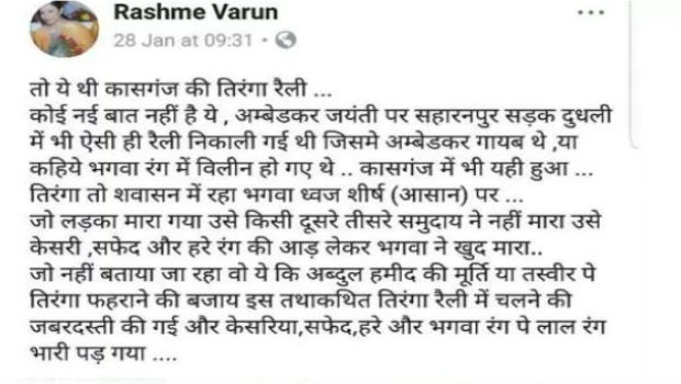 कासगंज दंगे के बाद यह पोस्ट लिखी है सहारनपुर की एक महिला अधिकारी रश्मि वरुण ने। उनकी यह पोस्ट सोशल मीडिया पर वायरल हो रही है। सहारनपुर में उप निदेशक, सांख्यिकी के पद पर तैनात रश्मि वरुण ने अपने फेसबुक पोस्ट में कासगंज हिंसा की तुलना सहारनपुर के मामले से करते हुए एक बार फिर राजनीतिक हलकों में उबाल ला दिया है।