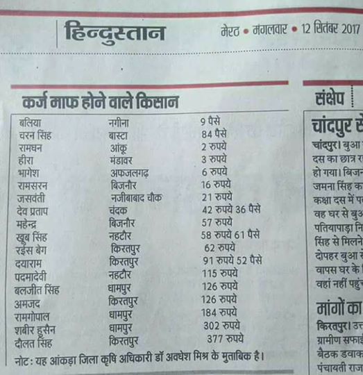 कर्जमाफी की खबरें और किसानों का मजाक उड़ाती कर्जराशि की सूचियां हर रोज किसी न किसी स्थानीय अखबार में छप रही हैं। इतना ही नहीं मुख्यमंत्री की असंवेदनशीलता यह है कि वह खुद 73 या 75 रुपए कि कर्जमाफी का प्रमाणपत्र मंचों से किसानों को प्रदान कर रहे हैं।