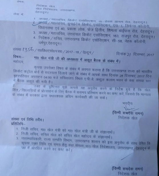 बीसीसीआई, मीडिया व प्रदेश सरकार को सुप्रीम कोर्ट के निर्देश की जानकारी है। वहीं सुप्रीम कोर्ट में मामले की अगली सुनवाई जनवरी के दूसरे हफ्ते में होना तय है। ऐसे में राज्य के खेल मंत्री का मान्यता मामले में आगामी 28 दिसंबर (पत्र सं0 1356/रा0क्रि0एस0पत्र0/2017-18/दे0दून दिनांक 21 दिसंबर 2017) को क्रिकेट एसोसिएशन की बैठक बुलाना सुप्रीम कोर्ट की खुली अवमानना है।