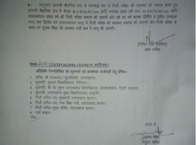 उत्तराखंड के किसी भी विश्वविद्यालय में अब प्राइवेट परीक्षाएं नहीं होंगी। यह बात 'उत्तराखंड मुक्त विश्वविद्यालय' के कुलसचिव प्रोफेसर आरसी मिश्र के हवाले से तब कही गई, जब उनसे पूछा गया कि आप कब से प्राइवेट परीक्षाएं शुरू करा रहे हैं।