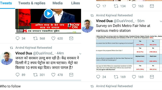 विनोद दुआ के नाम से बने पैरोडी अकाउंट से एक ट्वीट किया गया, जो कि ये था कि 'जनता को सरकार उल्लू बना रही है केंद्र सरकार ने दिल्ली में 2 रुपए पेट्रोल का दाम घटा कर मेट्रो का किराया 10 रुपए बढ़ा दिया। जनता पागल है?'