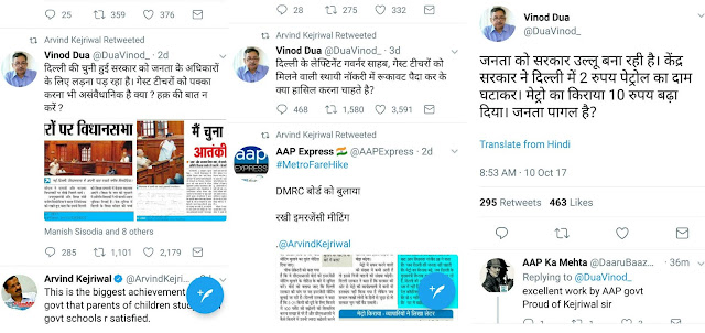 — एक और ट्वीट जो 1 अक्टूबर को विनोद दुआ के पैरोडी अकाउंट से किया गया है, 'दिल्ली में 2 सरकारें हैं, एक दिल्ली चला रही है दूसरी देश चला रही है, एक महंगाई कम करवाने के लिए लड़ रही है। दूसरी महंगाई बढ़ाने के लिए।' इस ट्वीट को भी अरविन्द केजरवाल ने रीट्वीट किया है।